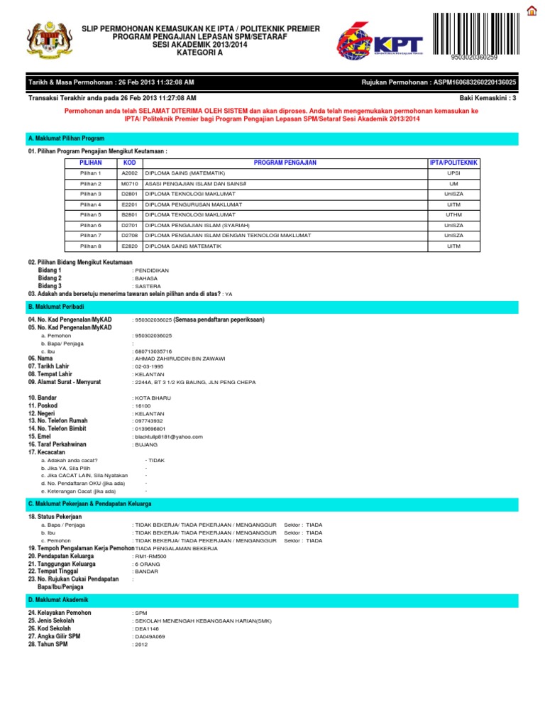 Slip Permohonan Kemasukan Ke Ipta / Politeknik Premier Program